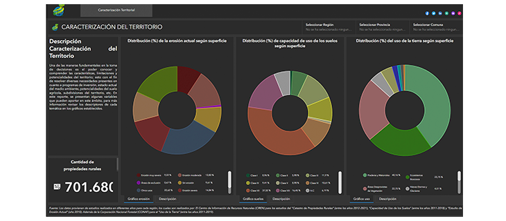 Los reportes que se puede encontrar hoy en IDE Minagri son de Caracterización Territorial , con datos que provienen de estudios realizados en diferentes años para cada región del país, y que son realizados Ciren para los estudios del "Catastro de Propiedades Rurales" (entre los años 2012-2021), "Capacidad de Uso de los Suelos" (entre los años 2011-2018) y "Estudio de Erosión Actual" (año 2010). Además de la Corporación Nacional Forestal (CONAF) para el "Uso de la Tierra" (entre los años 2011-2019).