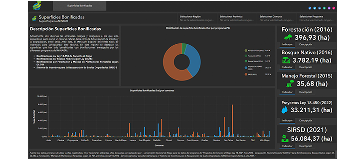 Por otro lado, se van a observar Superficies Modificadas. Se trata de la sistematización de superficies beneficiadas con bonificaciones entregadas por los diferentes programas del MINAGRI. Los datos provienen de datos y cifras registradas a nivel nacional en diferentes años, los cuales son realizados por, la Comisión Nacional de Riego para los datos del programa de "Proyectos de Fomento al Riego Ley 18.450", Año 2022, la Corporación Nacional Forestal (CONAF) para Bonificaciones a Bosque Nativo según DL 20.283, a Forestación y Manejo de Plantaciones Forestales según DL 701, entre los años 2015-2016 y el Servicio Agrícola y Ganadero (SAG) para el "Sistema de Incentivos para la Recuperación de Suelos Degradados (SIRSD) correspondiente al año 2021."