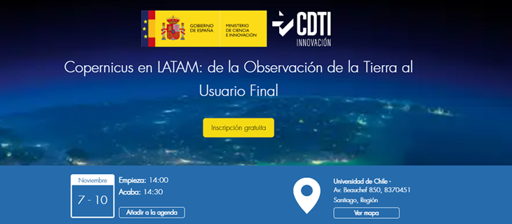 Déjate INSPIRAR por 50 ponentes expertos en #COPERNICUS, el Sistema Europeo de Observación de la Tierra, de acceso libre y gratuito. EXPLORA las infinitas posibilidades del uso de datos y aplicaciones basados en Copernicus, en todos los sectores, conociendo los servicios que te ofrece, y; observando casos de éxito en el uso de Copernicus, presentados por centros de investigación, empresas, e instituciones gubernamentales, en 5 áreas temáticas de interés para el Continente Latinoamericano: Monitoreo del movimiento de la tierra y el suelo; Riesgos naturales y antropogénicos; Vulnerabilidad de los ecosistemas; Expansión y sostenibilidad urbana, y; Agua. ACTÚA, aprendiendo a acceder a los datos de Copernicus, conociendo cómo emprender en el sector de observación de la Tierra, colaborando e interactuando con expertos y entidades que ya trabajan con éxito empleando Coperncicus o desarrollando posibles aplicaciones downstream para tu negocio. PARTICIPA, de forma gratuita, del 7 al 10 de Noviembre en Santiago de Chile (también con un evento paralelo el día 6, "Innovate with EU Space Data" por Expertise France), de una semana de inspiración y networking (reuniones B2B, Cena de Networking, ..) en torno a Copernicus, y únete a la comunidad Copernicus en LATAM!