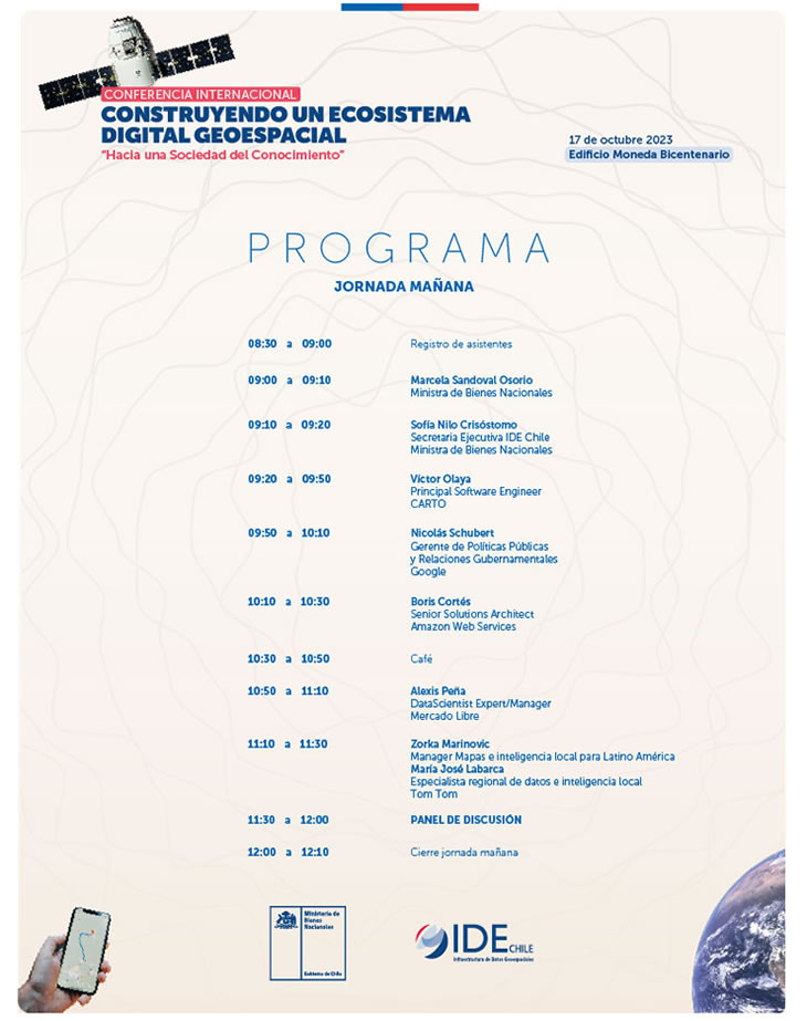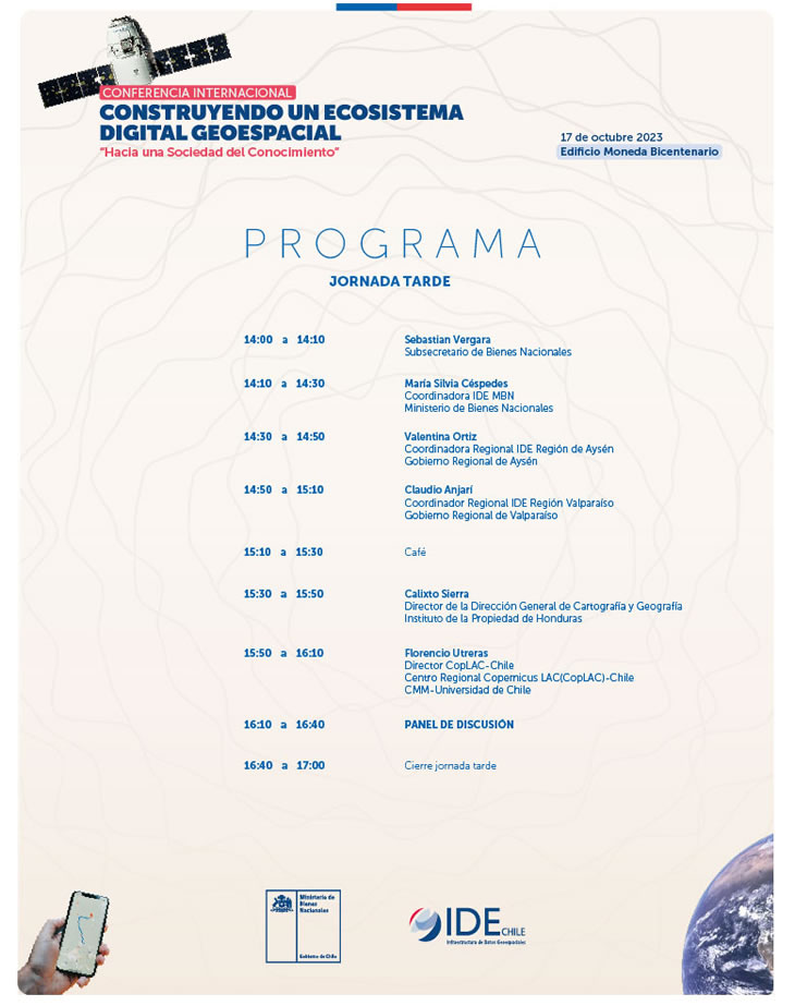 La actividad tendrá lugar el día martes 17 de octubre en el Edificio Moneda Bicentenario ubicado en Teatinos 92 Santiago de Chile y congregará a destacados expositores nacionales e internacionales vinculados a la gestión de información geoespacial.