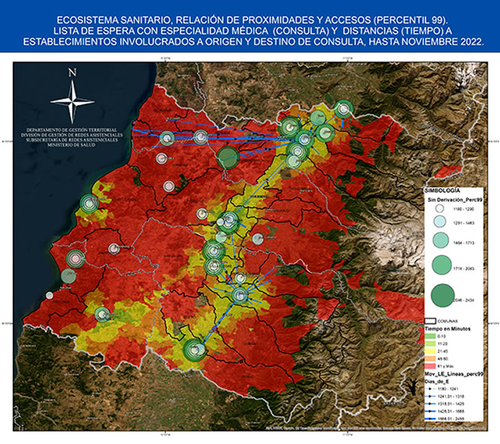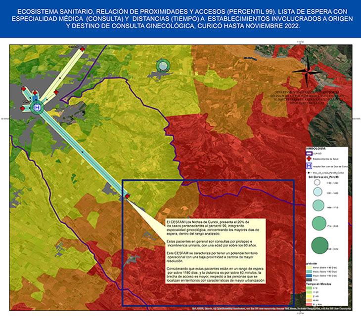 Por otro lado, a partir de la identificación de las personas que componen el percentil 99 (aquellas personas que más están esperando) se distinguió el acceso a la prestación, de la proximidad de la persona para resolverla. El resultado de este ejercicio (percentil 99), identificó alrededor de 60 mujeres, adultas mayores, de zona rural fuera de un anillo concéntrico próximo a un establecimiento de salud resolutor, que estaban a la espera de una prestación ginecológica. Ello sugiere la pertenencia de analizar con enfoque de género y derechos, la Lista de Espera, principalmente en patologías que afectan más a ciertos grupos etarios en donde la pesquisa oportuna es clave en el curso de los diagnósticos.
