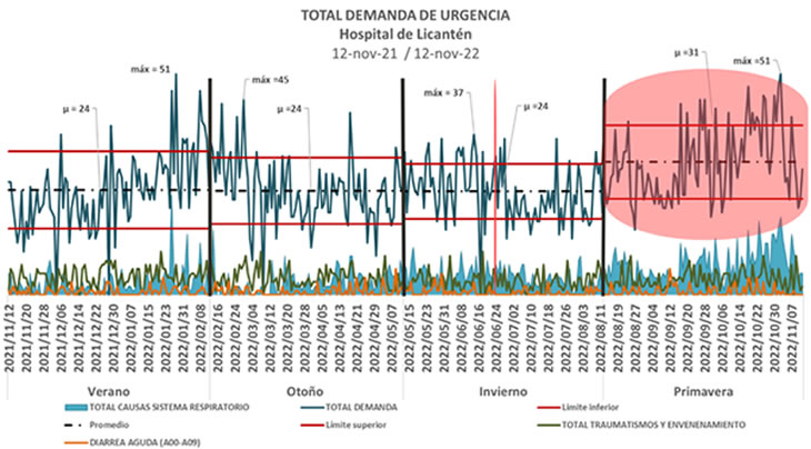 En el gráfico se puede observar el comportamiento de la demanda de atención de urgencia en el Hospital de Licantén para el año 2022 por estaciones . Se puede identificar una demanda de Atención de Urgencia por encima de su comportamiento normal (1 desviación estándar) en los meses de enero a marzo y septiembre a octubre, principalmente debido a causas respiratorias (brotes de Covid-19). Además, es posible observar un aumento significativo en el promedio de atenciones diarias durante la estación de primavera (12 de agosto a 12 de noviembre), pasando de 24 a 31 demandas diarias explicadas principalmente por causas respiratorias.