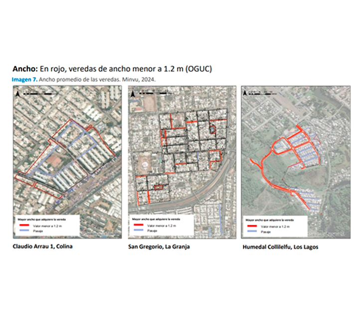 En cuanto al análisis geoespacial, se desarrolló una herramienta basada en ArcGIS Survey123 con un modelo de 70 campos. Esta herramienta permite analizar aspectos asociados a la peatonalidad, tales como el ancho de la ruta accesible, la existencia de cruces peatonales accesibles, pendientes de cerros, así como factores de seguridad como elementos reductores de velocidad en pasajes, iluminación pública y vigilancia natural potencial desde comercios abiertos, entre otros. Con este sistema se elaboró una cartografía de polígonos de manzanas segmentadas en unidades denominadas “cuadras”, cada una de las cuales contiene la información completa de cada encuesta. Los resultados permitieron identificar barreras físicas con un nivel de detalle sin precedentes.