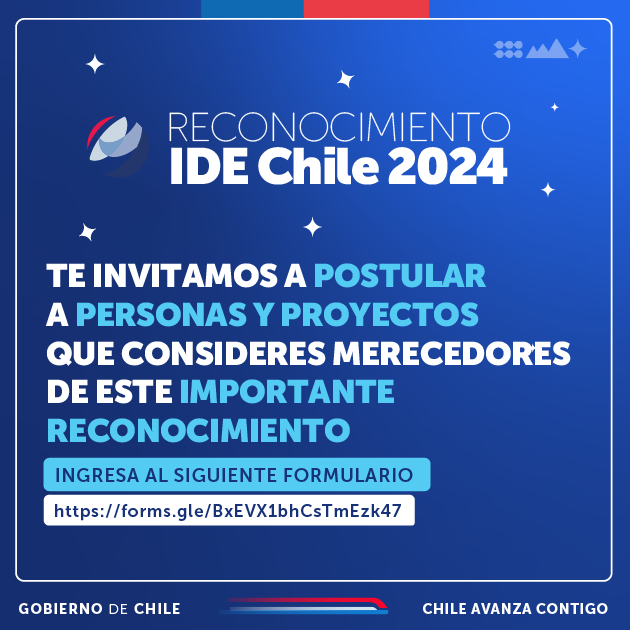 La comunidad geoespacial de Chile está en constante evolución, impulsando innovación y excelencia en el ámbito de las Infraestructuras de Datos Espaciales (IDE). Por lo mismo, hemos abierto este espacio para reconocer y premiar a aquellos individuos y proyectos que han destacado por su dedicación, creatividad y contribuciones sobresalientes al desarrollo y uso de la IDE en nuestro país.