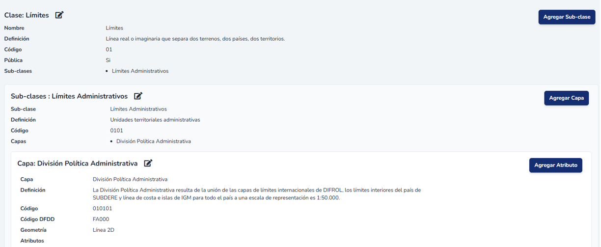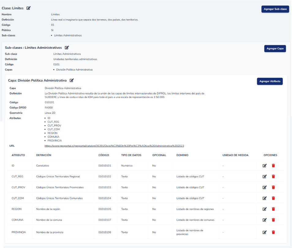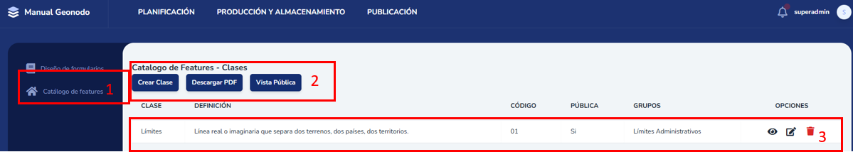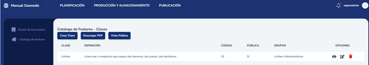 El módulo de catálogo de features permite realizar la descripción detallada y normalizada de capas de información geográfica, siguiendo la norma ISO 19110. Permitiendo crear y documentar Clases, Subclases, Capas y Atributos.1. Interfaz del módulo