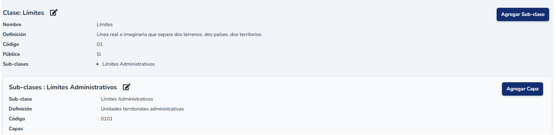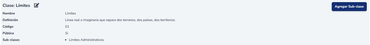 Con el botón Agregar Sub-clase podrá crear unas más subclases, en donde deberá indicar, el nombre, definición y código el cual ya está autocompletado con el valor de la clase (primeros dos carácteres).