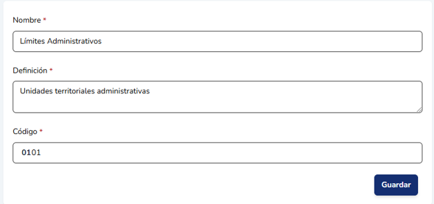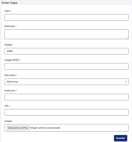 Para agregar una capa haga clic en el botón “Agregar Capa”. Deberá indicar el nombre de la capa, la definción, completar el código (tiene precargado los primeros 4 carácteres), el código DFDD, la geometría, el nombre de la institución a cargo de generar la capa, la URL de acceso a la capa y opcionalmente puede subir una imagen de referencia.