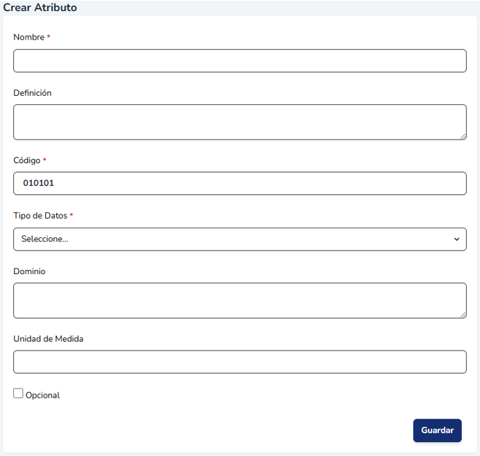 Para agregar un atributo haga clic en el botón “Agregar Atributo”. Deberá indicar el nombre del atributo, la definición, el código (tiene autocompeltado los primeros 6 carácteres), el tipo de datos, las alternativas de cominio, la nidad de medida e indicar si el atributo es opcional o no.