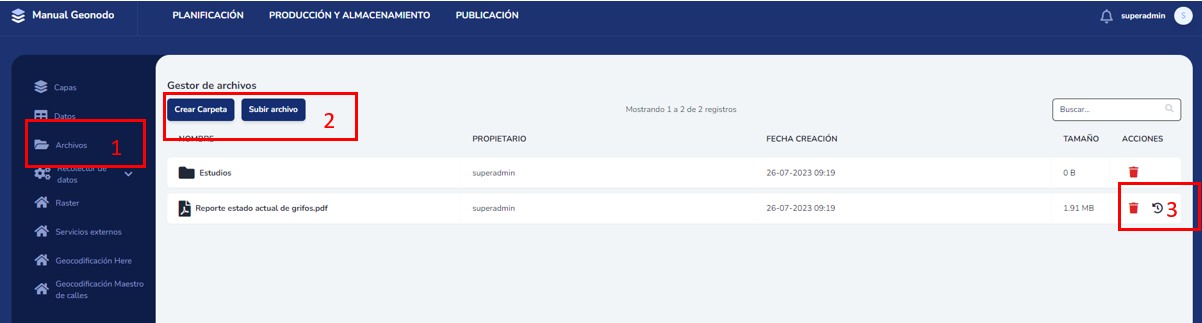 - A través del botón con nombre Archivos, presente en el menú lateral se puede acceder al módulo que permite la gestión de archivos en Geonodo.