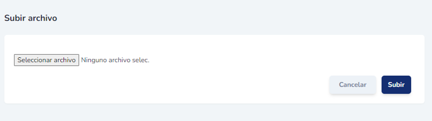 Permite subir un archivo de cualquier formato. Antes de subir el archivo asegúrese previamente de dar un nombre adecuado a este, ya que posteriormente no se puede modificar.