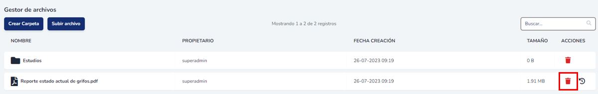 Permite la eliminación de carpetas y archivos. Considerar que, si elimina una carpeta también eliminara los archivos contenidos en ella.