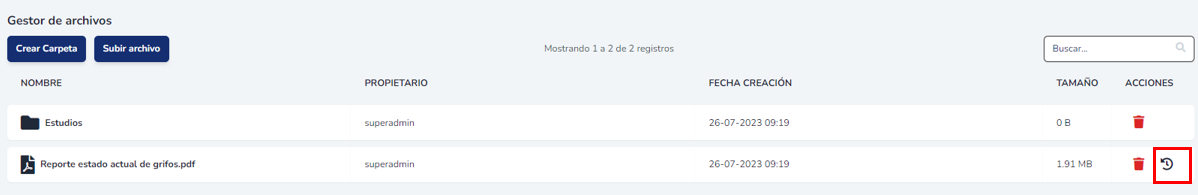 - Lista de archivos con opciones de eliminar y ver historial del archivo.