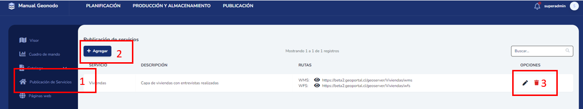 - A través del botón con nombre Publicación de Servicios, presente en el menú lateral se puede acceder al módulo que permite la gestión de URL de servicios de mapas en Geonodo.