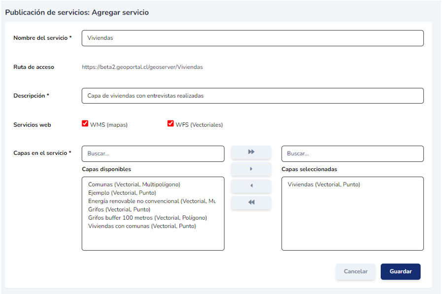 Permite indicar el nombre del servicio, agregar una descripción, habilitar las formas de publicación, las que puedes ser WMS y/o WFS, finalmente se deben seleccionar la o las capas que formaran parte de este servicio de mapas. Para terminar, haga clic en el botón “Guardar”.