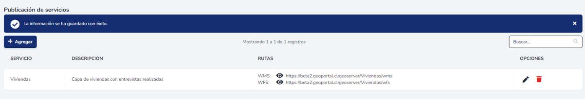 Luego de guardar, el registro quedará disponible en la lista de Publicación de Servicios. Desde esta lista podrá editar o eliminar el servicio.