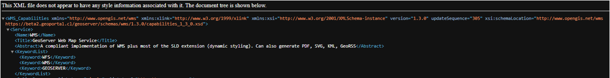 Como se ve en el ejemplo anterior, se generar dos URL de tipo WMS y WFS. Si hace un clic en el icono con forma de ojo, podrá acceder al XML de cada uno de los servicios de mapas.