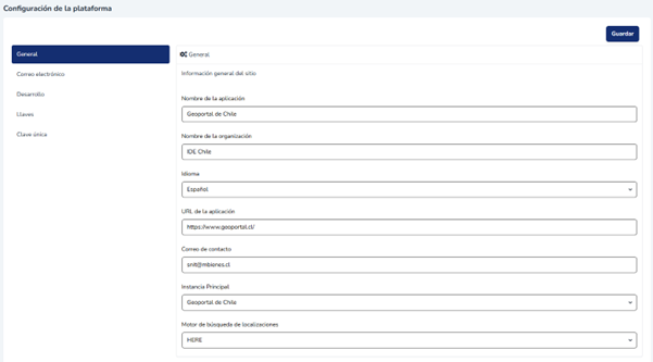 Al entrar a “Configuración general” se entra por defecto a este primer submódulo denominado “General”. Acá el superadministrador podrá completar parámetros relacionados con información general del sitio.