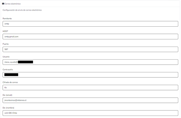 Para completar este formulario deberá solicitar los datos a su unidad de informática, además es probable que se deba habilitar en el firewall, de su institución, la comunicación a través del puerto 25 (o el definido por su institución) entre el servidor de correo y el servidor con la aplicación Geonodo.