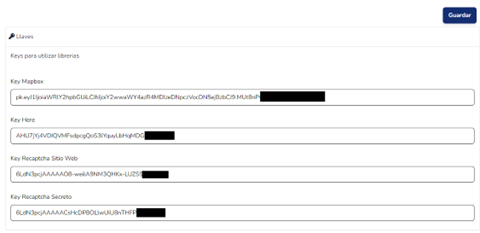 Estas llaves deben ser guardadas en la sección de llaves, presente en la Super Administración y en Configuración General.