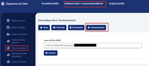 Para agregar el código de la API, debe hacer clic en “Producción y Almacenamiento”, luego en “Here Geocoding” y finalmente en “Mantenimiento”.