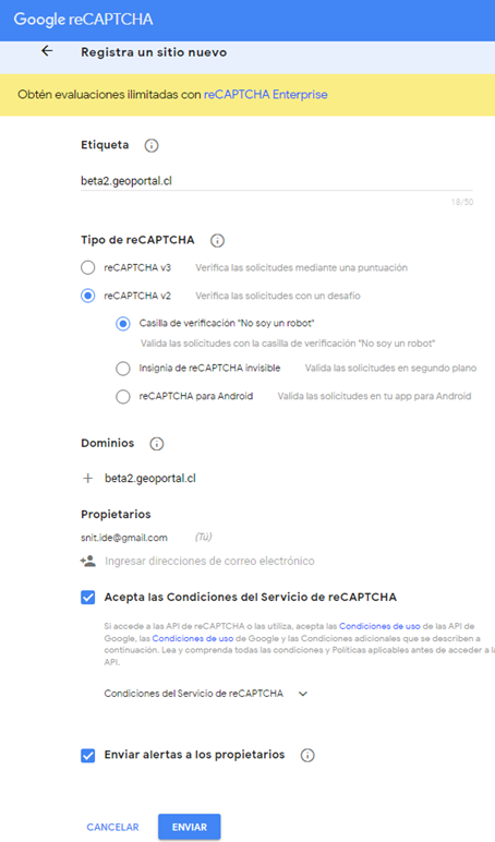 Para habilitar las key de recapcha haga clic en el siguiente link. (debe tener una cuenta de google)