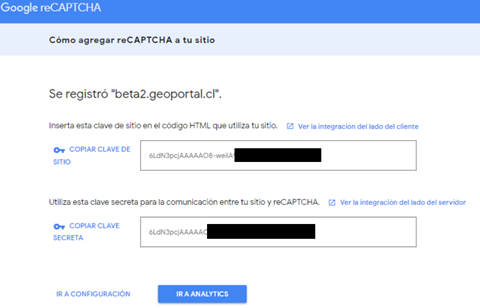 Al hacer clic en el Botón Enviar, se generan las dos claves que requiere Geonodo.