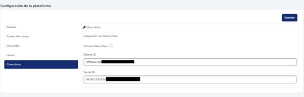 Este es un módulo permite la Activar o Desactivar del inicio de sesión por medio de clave única. Para poder iniciar sesión con clave única se debe registrar el Rut del usuario.
